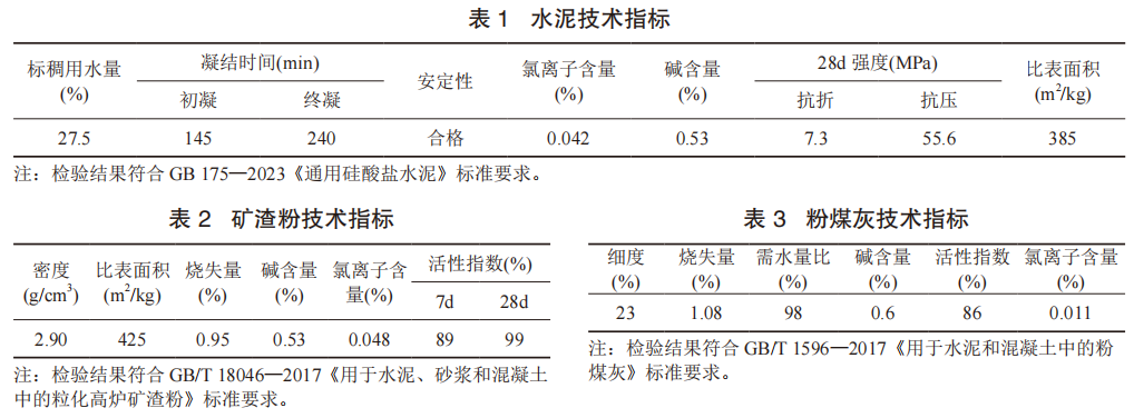 选用沧州临港金隅普通硅酸盐P·O42.5水泥,沧州中铁S95级矿渣粉,粉煤灰为河北国华热电F类II级。胶凝材料的性能指标见表1~3。